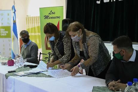 De la firma del convenio participó la secretaria general del gremio UnTER, Sandra Schieroni, la titular de la seccional Viedma del gremio, Elizabeth Barrera, el vocal gremial, Marcelo Nervi y el secretario de Desarrollo Territorial, Hábitat y Obras Públicas, Gastón Renda.